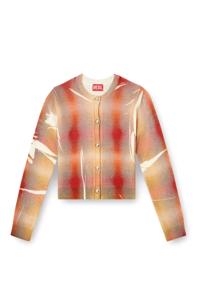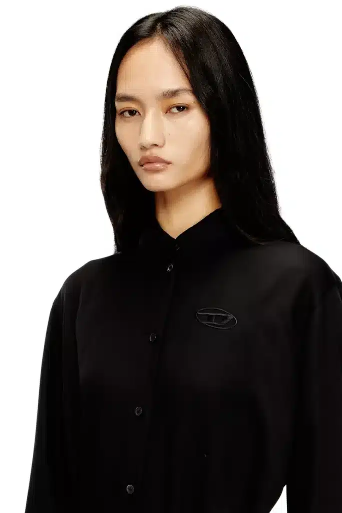 Instantly party-ready, this long-sleeve blouse is cut from foiled georgette and printed with a blurred rose motif in near bleached-out tones – an expression of Diesels experimental edge. The fluid, semi-sheer fabric catches the light with a metallic shine, while the metal Oval D logo at the back collar adds a signature finish.