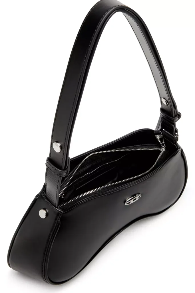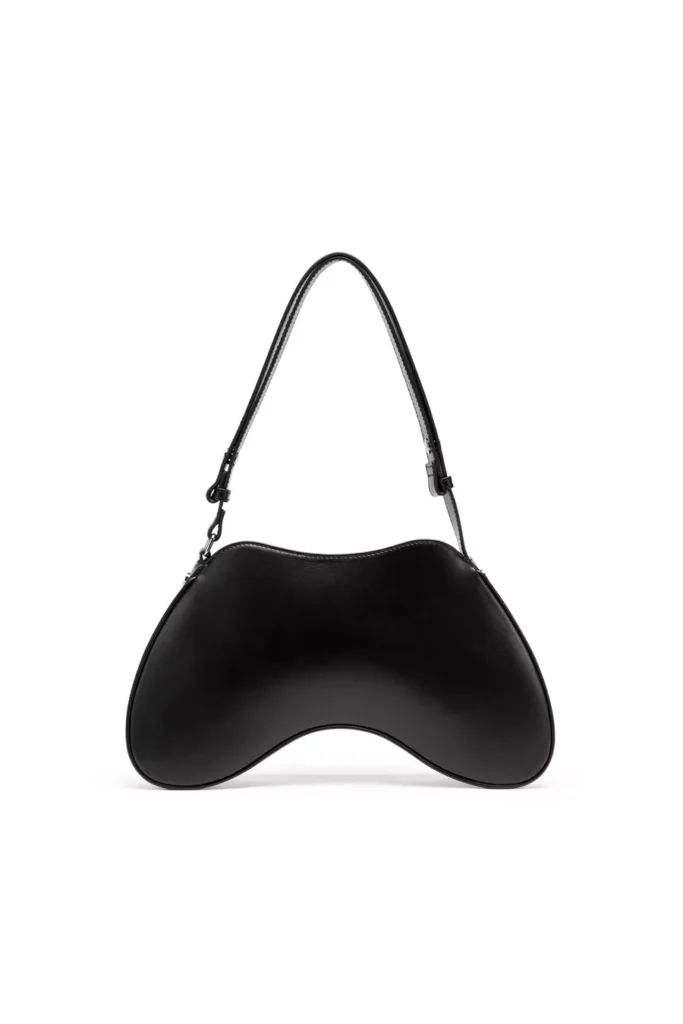 Sleek and playful, this womens shoulder bag is characterised by a sinuous shape inspired by gaming controllers. Its crafted from smooth leather with a semi-gloss finish, embellished by shiny Oval D hardware and fastened with a zipper at the top. The shoulder strap is adjustable to customise the drop.