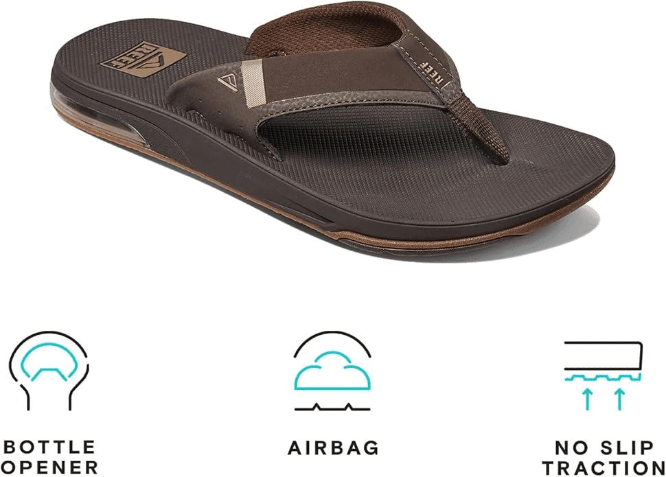 - FANNING LOW MEN’S SANDALS: Reef’s best selling flip flops for men with a bottle opener in the sole of the sandal. They are handcrafted with a comfortable footbed and anatomical arch support