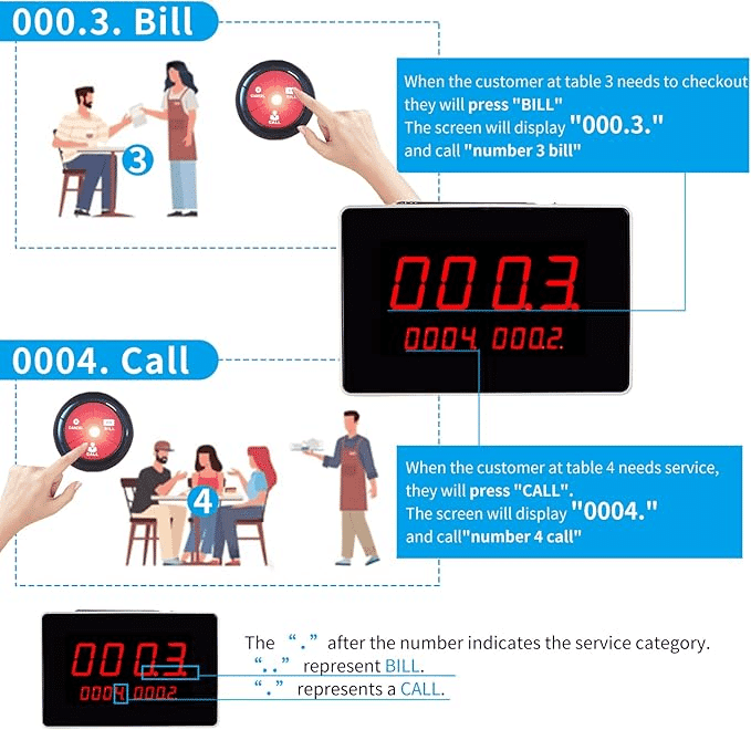- Display Receiver: We can freely set the table or bedside number, to help us quickly find the customer or patient in need. Wireless pager most support 999pcs wireless call button, pager easy to configure button, delete button, adjust volume and delete all number.